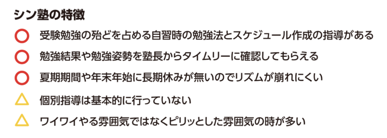 学習法指導×管理自習室×進路指導をサービスとする「個別指導塾」です。当塾は学習法の指導による勉強法の改善を行い、受験に集中できる自習室を用意し、塾生が自ら進んで学習する習慣が身につくような進路面談を提供しております。講義は原則行いませんが、必要と判断した場合は、個別での教科指導も実施しています。質問は随時、塾長が直接受け付けています。